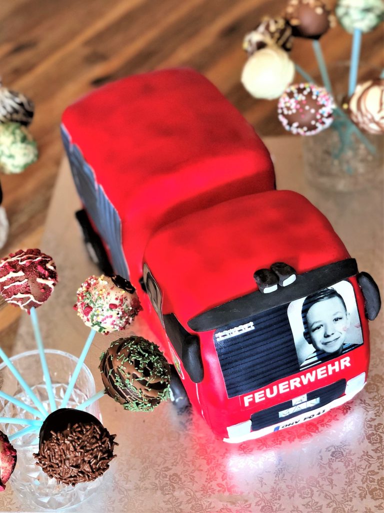 Biskuit – Feuerwehrauto mit Erdbeerfüllung und Schokolade.