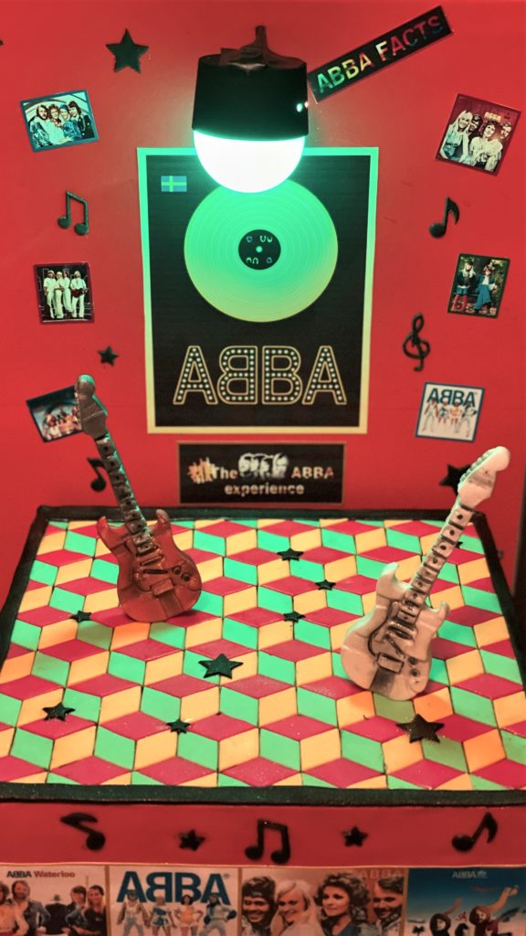 Mit schwarzen halben Klaviertasten, auf denen das für sie eigens komponierte Lied zu lesen ist.
