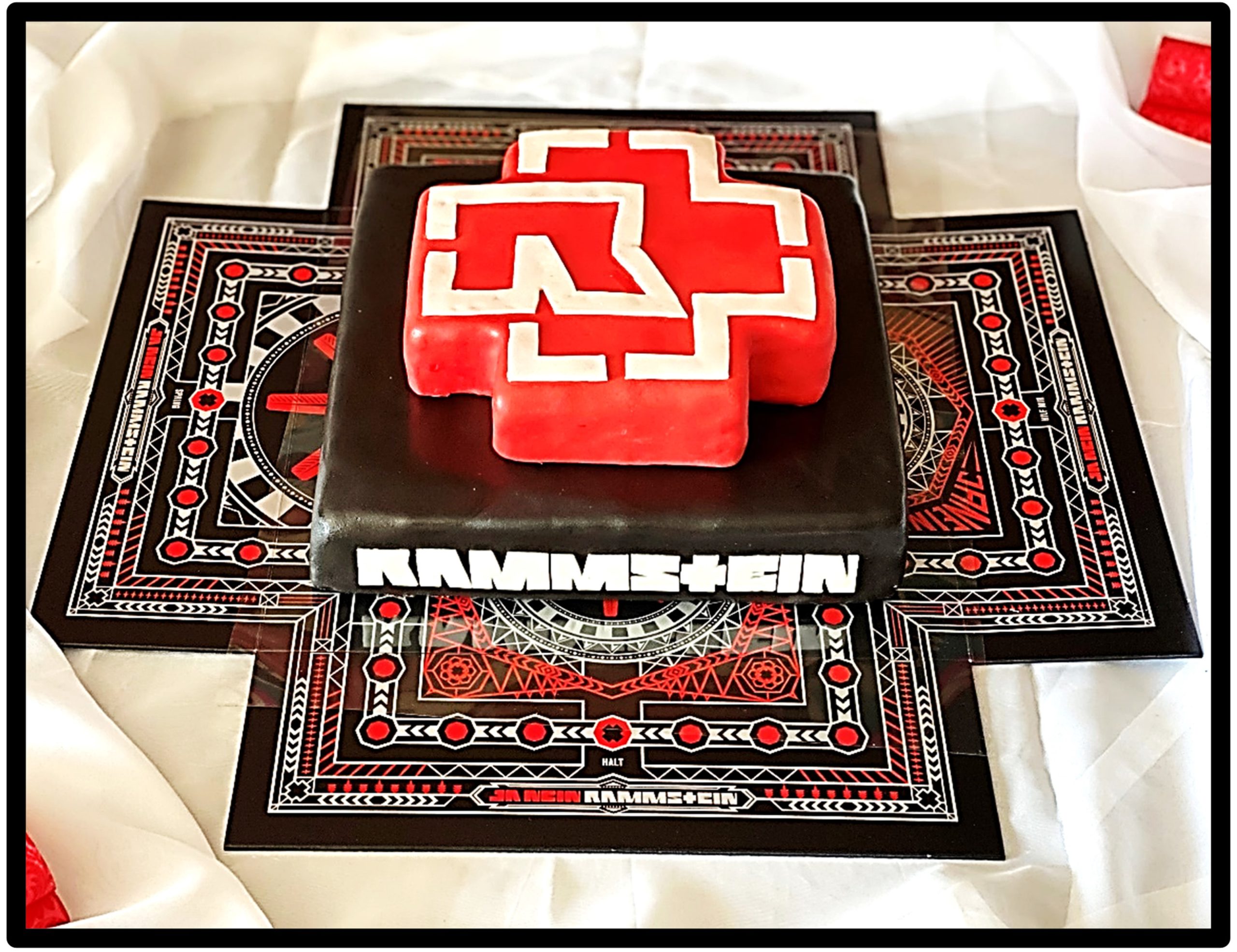 einem roten Fondant – Mantel und mit Pininenkernen gespickt.