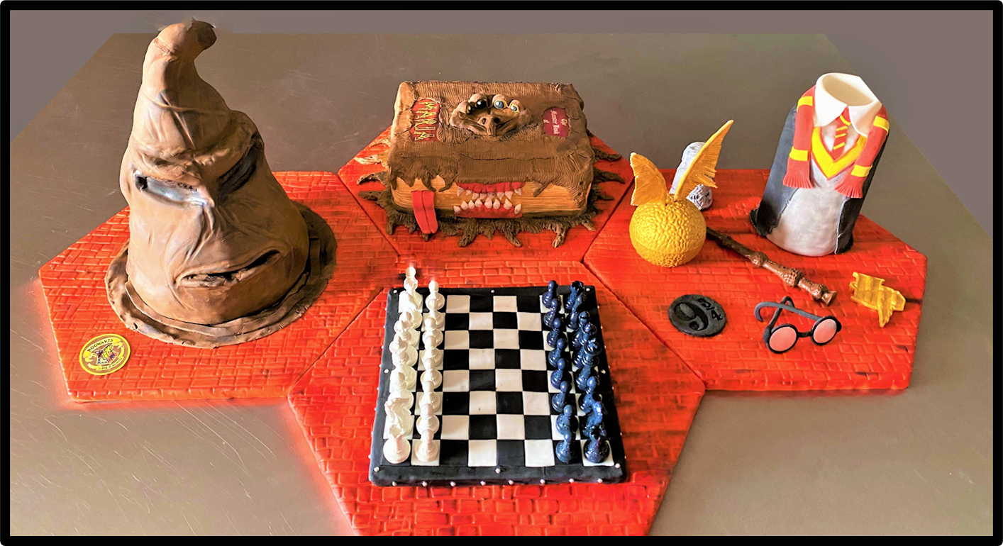 Der goldene Schnatz, der Zauberstab, die Brille dürfen nicht fehlen. Die Schnee – Eule „Hedwig“ rundet alles ab.