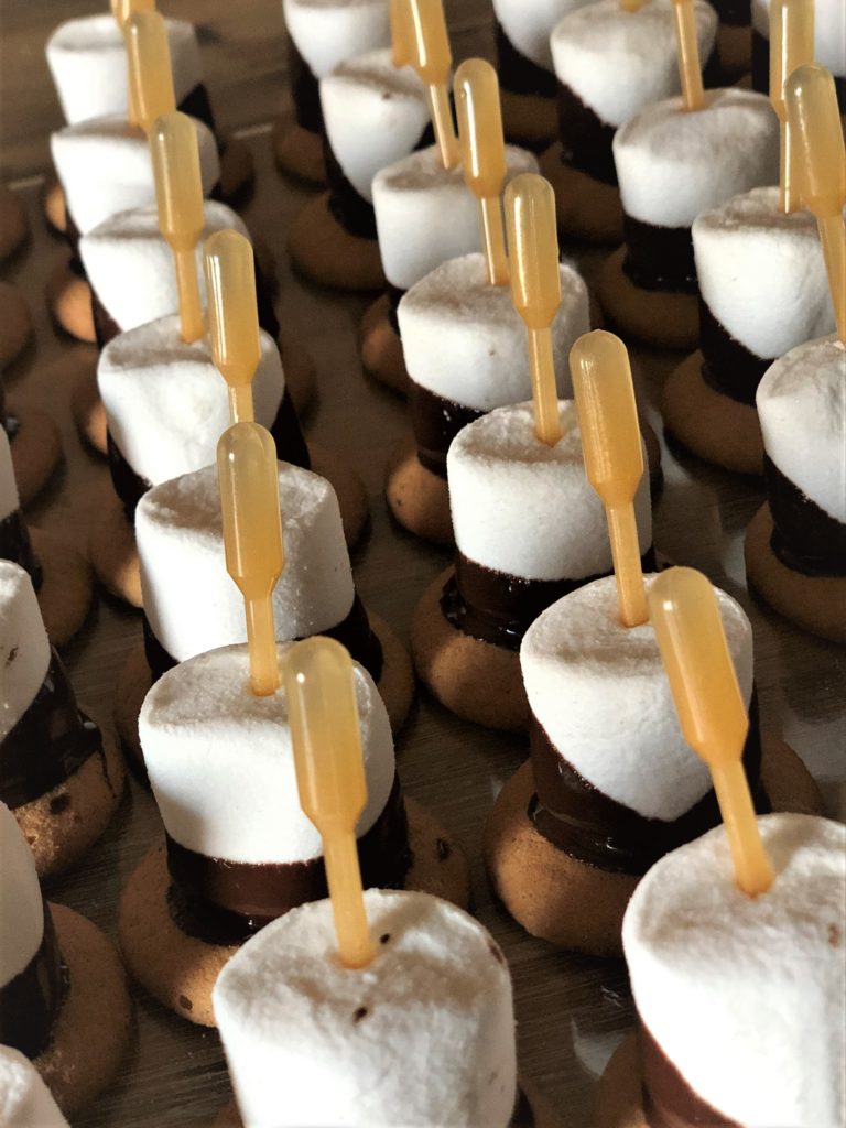 Marshmallows im Schokomantel auf Pistazienplätzchen mit einer Fruchtpipette, für den Frischekick.