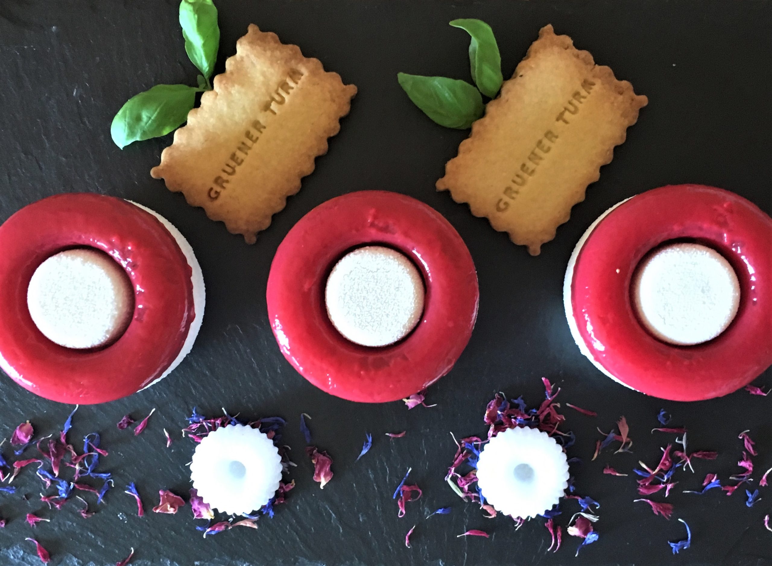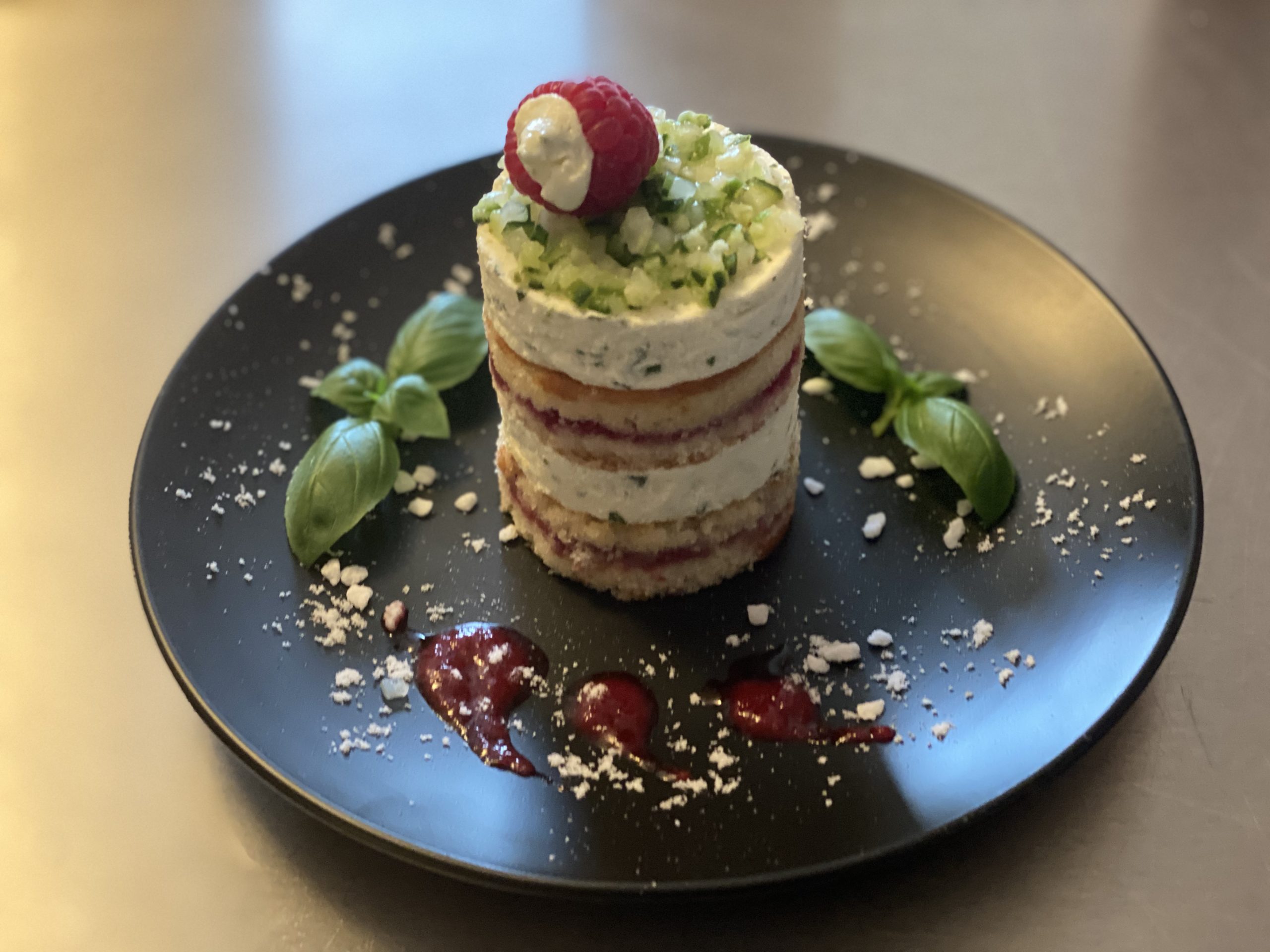 Basilikum – Frischkäsecreme, gefüllter Himbeere